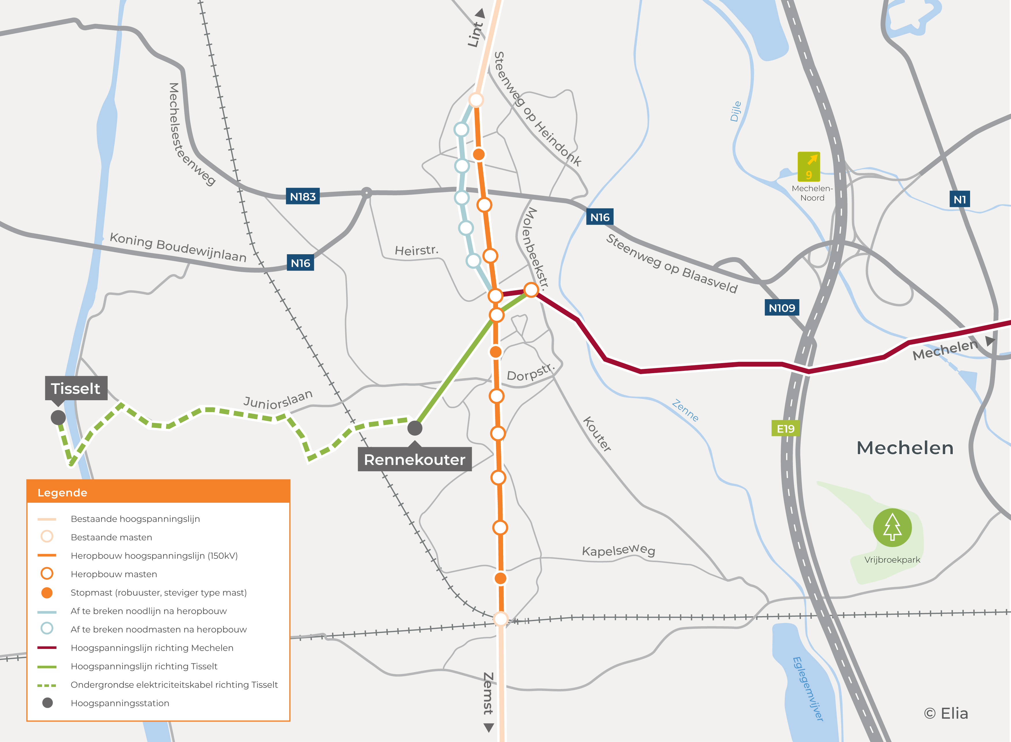 TracéElia reconstruira la ligne à haute tension 150 kV entre le Heffenveldweg et le Kapelseweg. Le niveau de tension restera le même. Les neuf pylônes qui ont été touchés par la tempête seront reconstruits aux mêmes endroits. Les nouveaux modèles seront plus robustes et capables de résister à des vents plus violents.