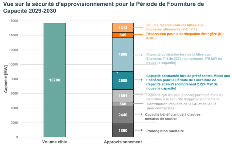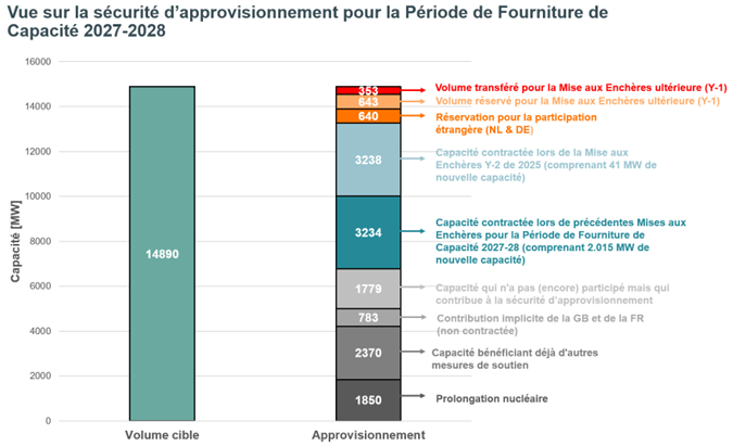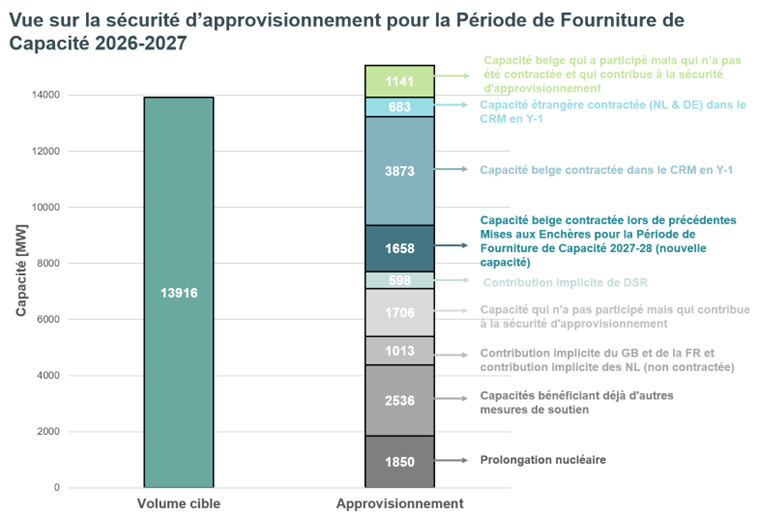 L’enchère Y-1 pour la période 2026-2027 vient clôturer les enchères pour l’hiver 2026-2027. Le besoin de capacité, basé sur la consommation de pointe, était fixé à 13.916 MW. Au total, 15.058 MW de capacité seront disponibles dans le système :