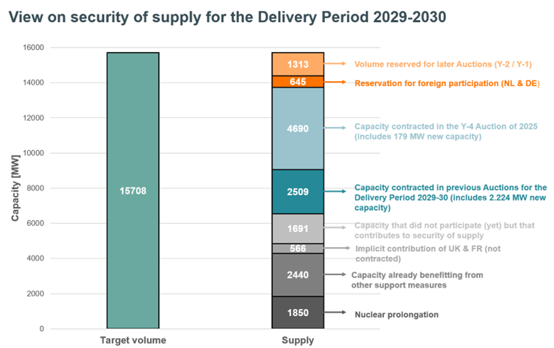 The volume for the Y-4 auction for the 2029–2030 delivery year was set by the minister at 6,997 MW. Following corrections during the auction process, this was adjusted to 4,694 MW. Corrections are made either downwards (by subtracting volume that is not eligible or does not wish to participate, accounting for 3,019 MW in this auction) or upwards (volume that does wish to participate and so foregoes other subsidies, accounting for 716 MW here). 69 CRM units participated in the auction itself, offering a total capacity of 4,998 MW. As such, supply exceeded demand. 65 CRM units were selected, offering a total capacity of 4,690 MW. This comprised 4,486 MW of existing capacity, 179 MW of new capacity (new batteries, 525 MW nominal) and 25 MW of refurbished capacity.